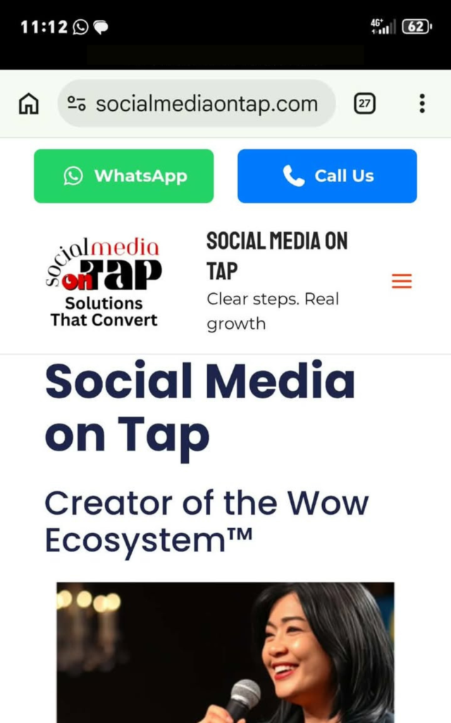 - Two custom buttons: WhatsApp and Call Me, direct, human, instant.